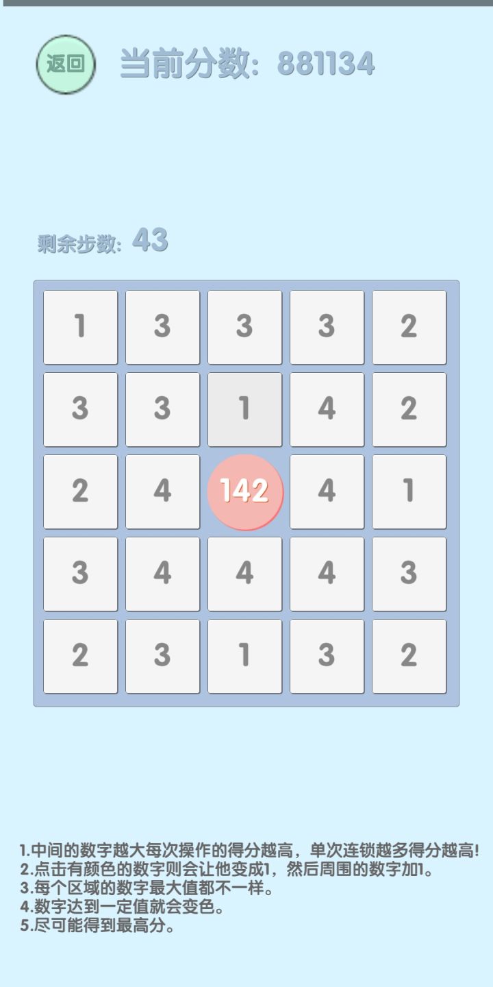 刚上来觉得有点新意,但玩了一会儿琢磨出来大致的规律就没意思了。像这样外圈内圈循环可以稳定增长步数和中间的数字,到后面就换成单纯的刷分了。