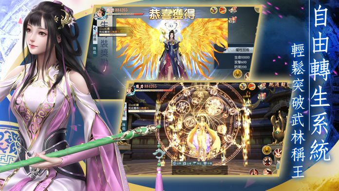 在遊戲中設有轉生系統,每次轉生都能突破境界,解鎖高階裝備更能獲得外觀獎勵,不斷提升屬性,征戰江湖成為至尊。