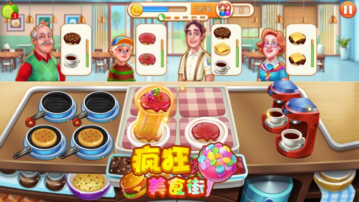 2020最新时间管理游戏,【疯狂美食街】上线啦。这是一款让你烹饪世界美食的餐厅经营类游戏,解锁美食店、烹饪美食、招待顾客,让顾客称心而来,满意离去。你就是餐厅的大厨 ,烹饪各种美食招待顾客,要有耐心,顾客的需求是各种各样的哦;