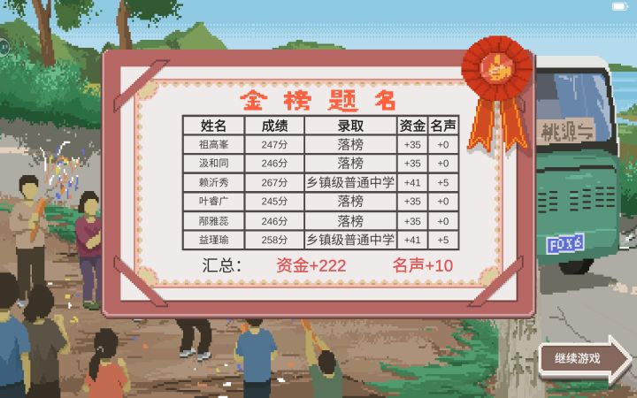 通关啦!!!感觉特别有成就感。刚开始没玩明白,第一届跟着教程走,很幸运遇到了两个独特教具,每天上3节课加布置作业,努力赚钱上课外活动维持学生心情,后面都考上了县重点高中。就在我以为我第二届要靠着两个独特教具大杀四方的时候,结果告诉每一届道具和卡牌都要重置,当时想的是没关系,就算是这样我也能带着我的学生考上更好的学校,我继续用我第一届的打法给学生上3节课不布置作业,上课外活动,结果就是第一次期末考试的时候全员不及格,800分的及格线啊,都不及格,对我打击很大。然后我痛定思痛,每天上四节课,加正常布置作业,上课外活动来维持心情,第二次期末考试3200分的及格线终于是全部及格了,接着我就行这个节奏到中考,考完以后我沉默了,虽然都考上了,不过考上的都是县普通高中,还没我第一届考的好。我复盘了一下,发现独特教具特别重要,外加第一年要打好基础,才能考得上好高中。图片中的是我第7届的学生,集合了我前几届的经验,外加一件靠钓鱼就能加卡牌倍数的独特教具,以及4件金色教具和一件彩灰色教具(教育经验满级之后会加一个教具槽所以有6件),然后每天上6节课,布置很多作业,上踢毽子课外活动加做饭(食谱:一个紫苏,一个辣椒,一个田鸡也就是青蛙,两个松茸,一条桂花鱼)给同学们吃来维持高心情(90以上),才得到的结果。重复的钓鱼(下完课后用接近150的体力钓鱼,放假的时候用接近300的体力钓鱼,为什么有300呢,因为睡一觉起来就有150的体力,加上做饭给自己吃能加90体力,还有吃野葡萄能加40体力,这时候又要问了,做饭吃能加那么多吗?有食谱的,鲫鱼汤,效果是吃完额外加8点体力,选一条80营养值以上的鲫鱼,加2个南瓜,食材的营养值加在一起越高,加的体力越多)有点枯燥,但是结果是好的,我的学生都考上了世界知名高中,有一个甚至考了850分满分,绝对是世界级的状元了。通关以后真的是太有成就感了。但是通关后继续玩下去的动力大减。不过这游戏还是好游戏。值得一玩