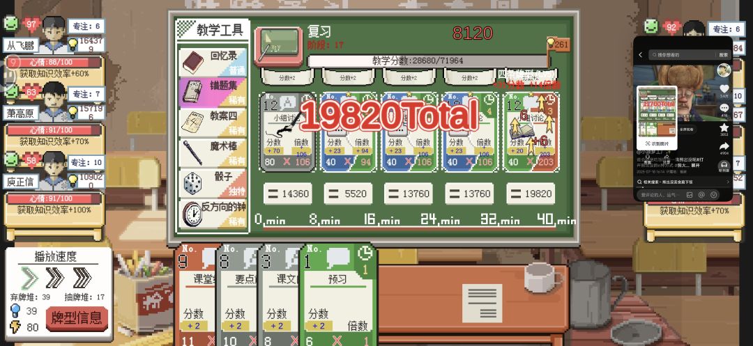 差不多 10w 多点的知识就可以 800 分了。 体育馆和教室都是 2 级,大部分都是钓鱼和种地赚钱,山就登顶过一次,没好东西就没咋登山了。 关于我玩游戏的一点拙见: 1、家访 家访真的真的很重要,专注高的点勤奋,勤奋高的点专注。专注和心情是加课上打牌知识量的,勤奋是加课后作业知识量的,所以,在学生有勤奋值的时候,可以毫不犹豫的给他很多作业,前提要用课外活动把心情值提上来。心情值高了但是勤奋值用完