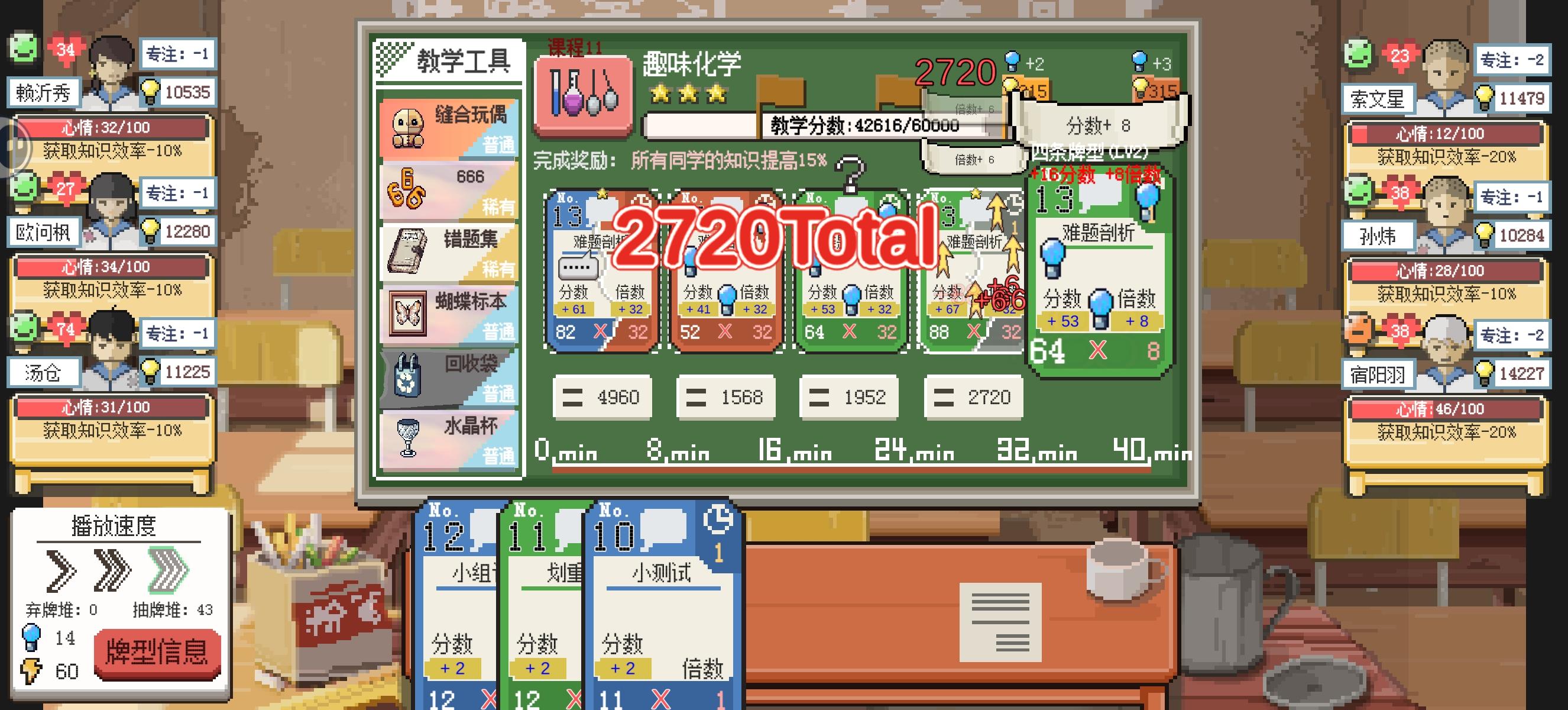 快速增长知识就在第三年的最后一天,手里只有5张6叠666叠的飞起。我融的牌是复读和结算分数永久加6,配合绿竹分数涨得非常快,不过最大的原因还是后期有钱,每天可以吃牛肉和给同学们煮牛肉。