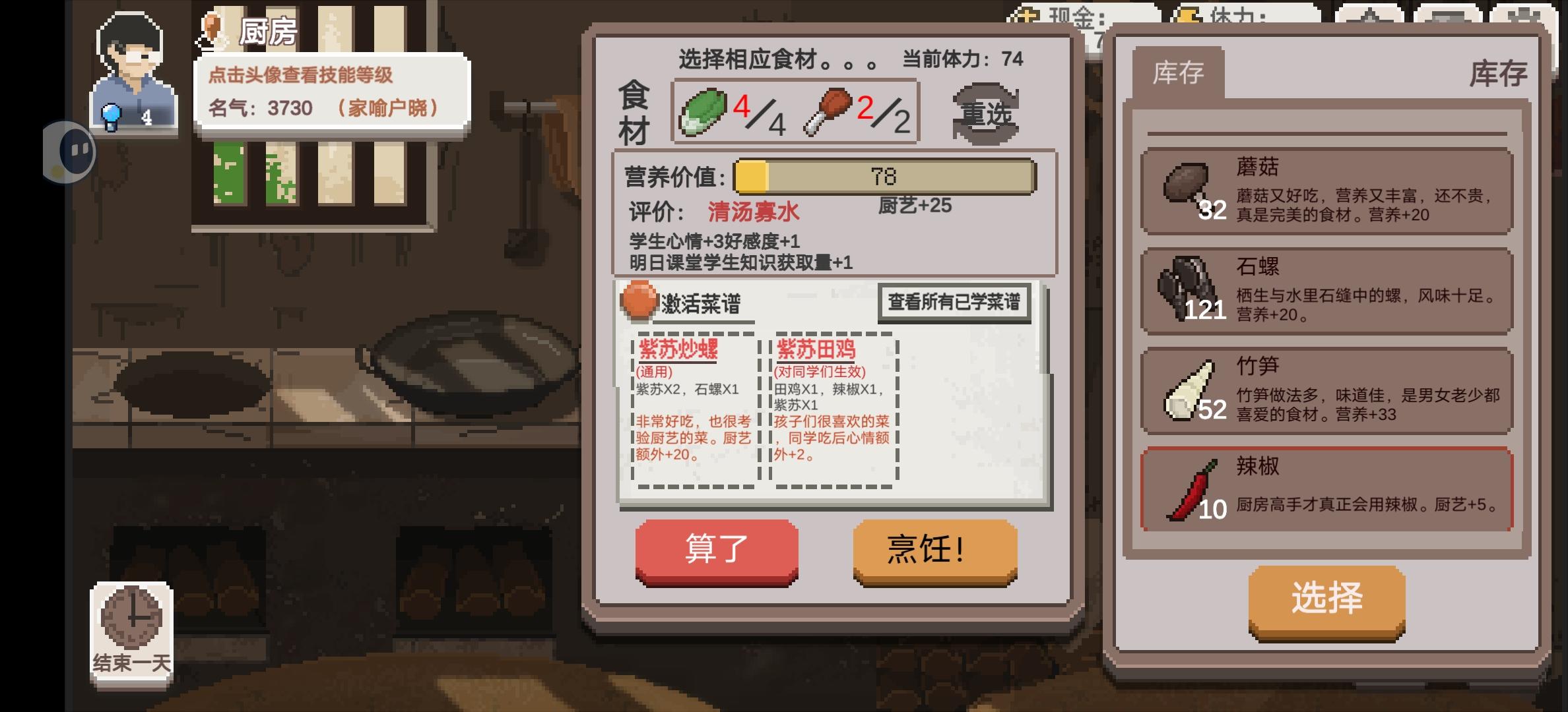 湖边钓鱼只要刷到这个对话,80%能得到一条鱼,学生钓鱼时对话也能得到一条鱼农田区跟老田对话概率获得田鸡X2,学生对话能得到泥鳅印刷厂跟小妹妹对话概率获得活动器材X2学生做饭紫苏X3,辣椒X1,螺X1,田鸡X1,能混合做出2道菜(考试前不要给学生做饭,学生大概率会拉肚子,我试了3遍)松茸鱼做不做好感度也就+3,还不如拿去卖了世界级知名中