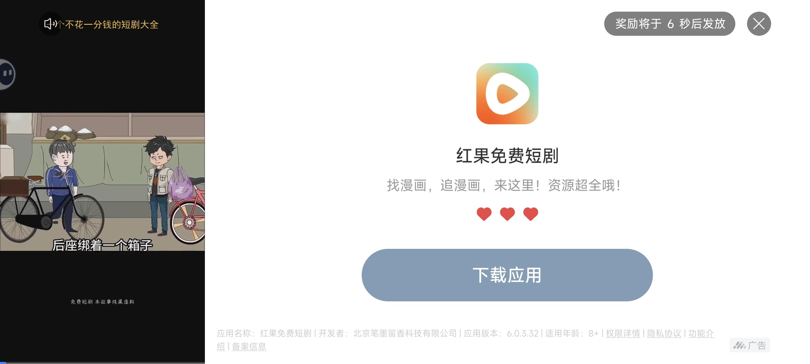 这个红苹果短剧的广告是不是有问题,每次播放剩6秒就卡着不动,也没有弹出什么选项来,试了十几次了