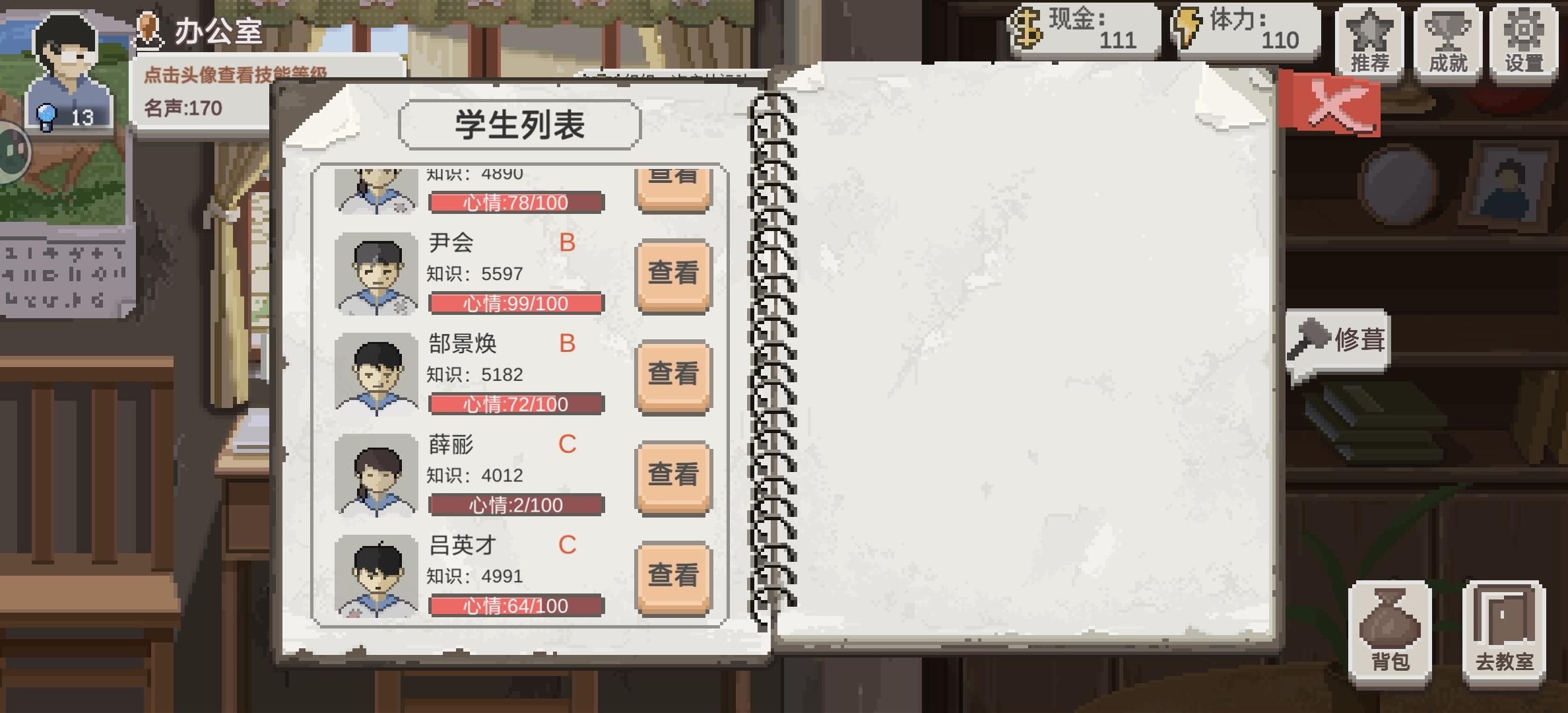 开局第一届学生散养,资质太差,体力急缺,让他们上最少的课,做最多的作业,挨最狠的骂,不给治病,顺便拿痛苦面具成就。体力打工钓鱼赚钱,跟钓鱼佬,种田大叔,登山佬,杂货店老板聊天加技能等级随便概率送鱼,送田鸡,送螃蟹,给菜谱。螃蟹留着以后给学生做菜,其他的先自己吃,搞到钱先把单车和鱼竿鱼线买了,然后升级学校,教室操场先升满。印刷厂买教具解锁绿竹就停。第二届开始正经养,买个土豆炖牛肉,蒸螃蟹菜谱