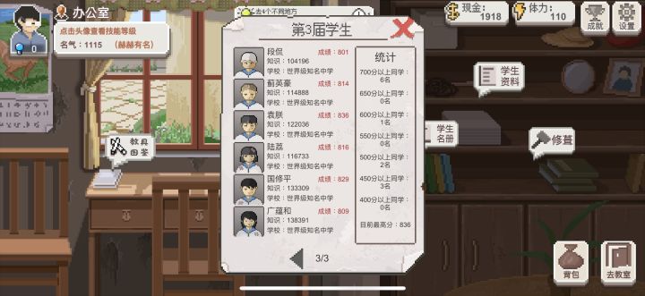差不多 10w 多点的知识就可以 800 分了。体育馆和教室都是 2 级,大部分都是钓鱼和种地赚钱,山就登顶过一次,没好东西就没咋登山了。关于我玩游戏的一点拙见:1、家访家访真的真的很重要,专注高的点勤奋,勤奋高的点专注。专注和心情是加课上打牌知识量的,勤奋是加课后作业知识量的,所以,在学生有勤奋值的时候,可以毫不犹豫的给他很多作业,前提要用课外活动把心情值提上来。心情值高了但是勤奋值用完