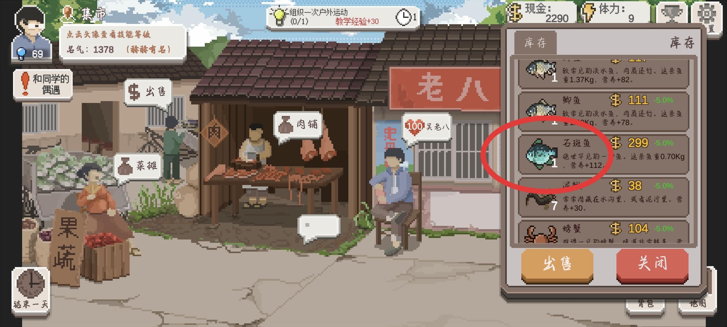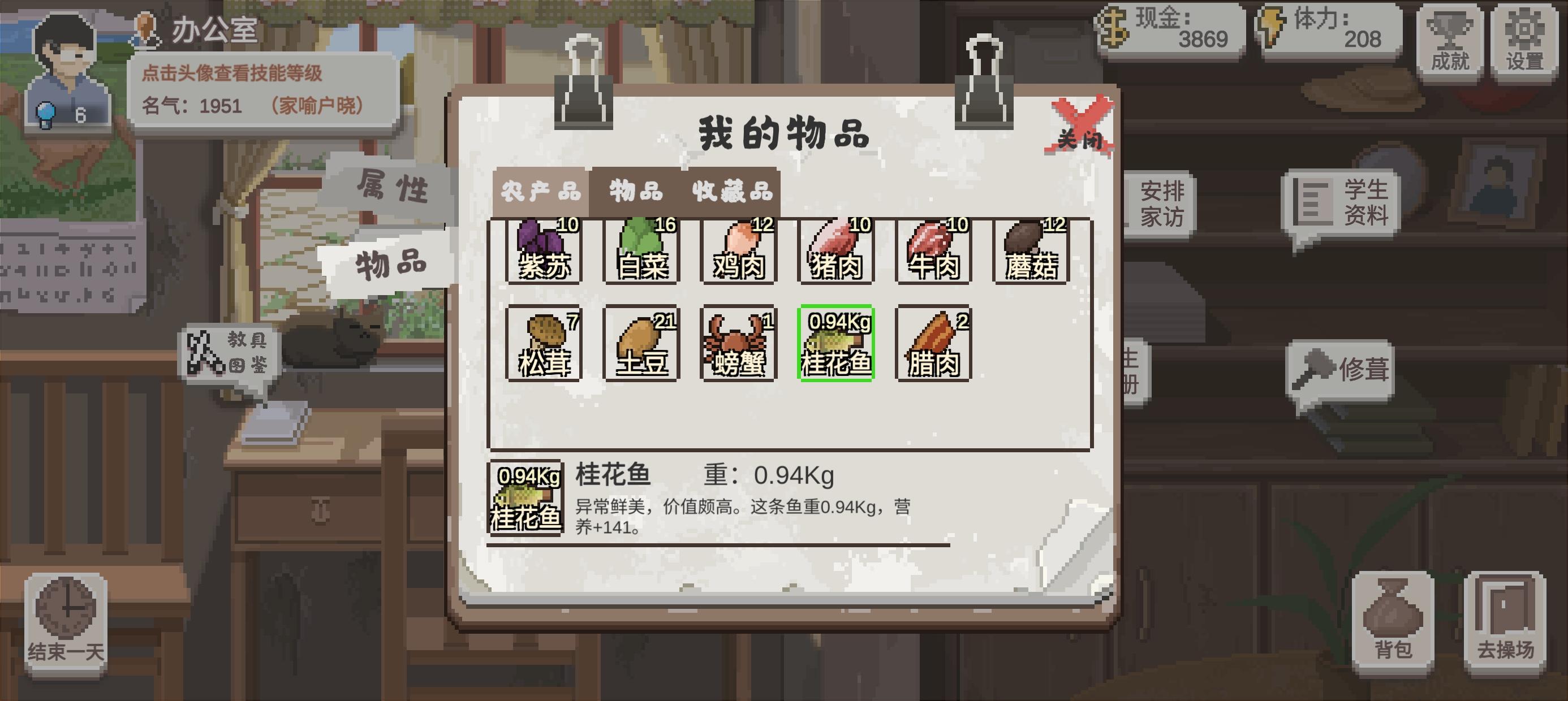 看情况吃土豆牛肉赚教学点,凑666教具,头筹,备用教材或黑板擦,魔术棒等。钓鱼留桂花鱼比如这条一直没舍得卖和吃的鱼给学生做菜,螃蟹可留可不留毕竟不怎么常见。开学先留体力整教具,然后是减少牌和精进牌,再复制6。有凸视镜可以69
