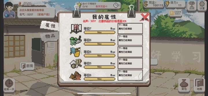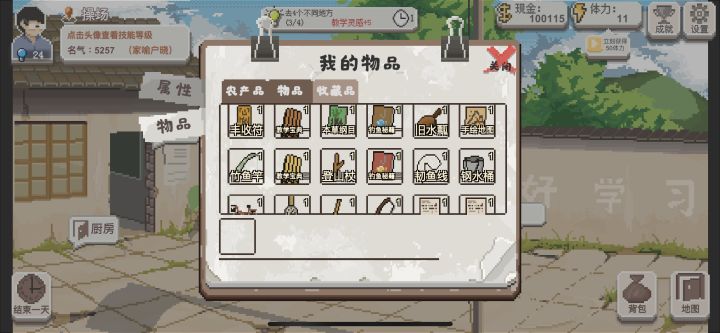 第四届通关了,最高的学生资质好像是s还是ss。教具方面,优先找克苏鲁,我的六件套是克苏鲁,骰子,钻石,教学章节三和四,错题本。一节课脸好几万几万的刷分。赚钱方面,还得靠种地种南瓜,偶尔钓鱼补给一下,有了钱就吃牛肉得灵感,平时有奖励的委托就做一下,没委托就不吃东西,直接开下一局。不要去印刷厂买教具,反正我买了两次,都没给我是怎么回事?花钱方面,优先买自行车,然后手表,然后升级学校,优先升级心情和
