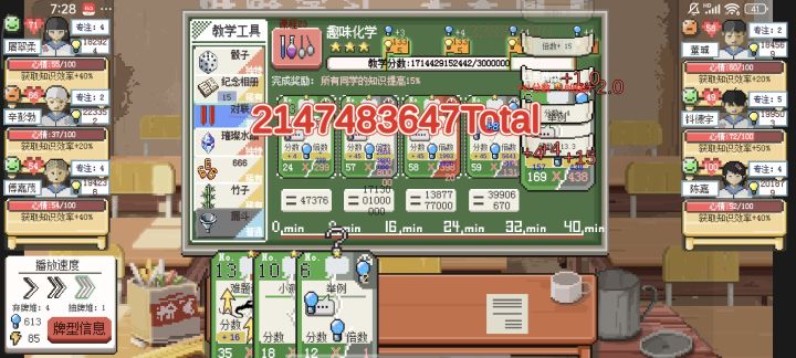 差不多 10w 多点的知识就可以 800 分了。体育馆和教室都是 2 级,大部分都是钓鱼和种地赚钱,山就登顶过一次,没好东西就没咋登山了。关于我玩游戏的一点拙见:1、家访家访真的真的很重要,专注高的点勤奋,勤奋高的点专注。专注和心情是加课上打牌知识量的,勤奋是加课后作业知识量的,所以,在学生有勤奋值的时候,可以毫不犹豫的给他很多作业,前提要用课外活动把心情值提上来。心情值高了但是勤奋值用完