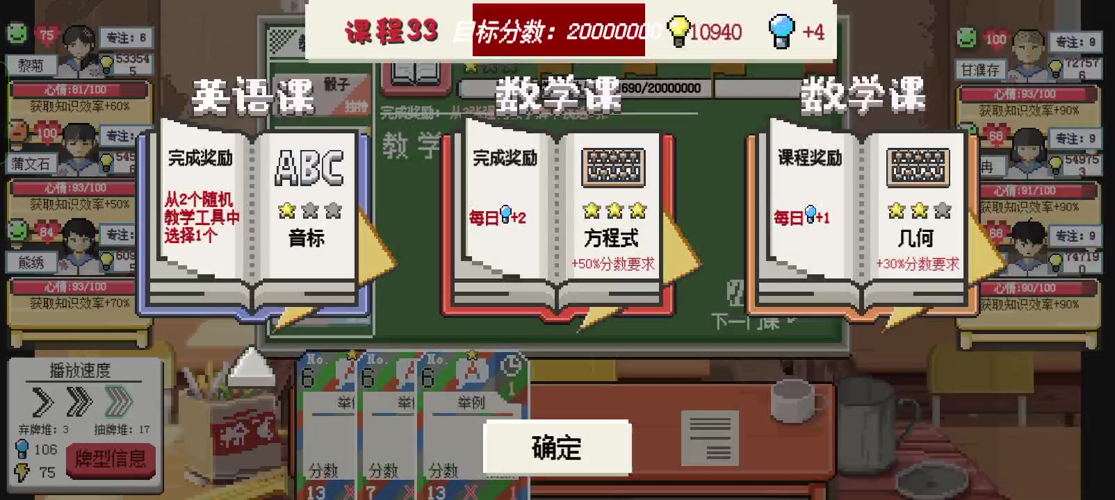 全员差不多150w以上知识,靠得回档技术,可以在前期比较容易的拿到相对好用的教具,每天上课的前2节课程是锁定的,刷的是从第3节课及以后的,最好的自然是出有3型四选一强化教具的课程,其实二星四选一也可以尝试。组教具方面,666教具的离谱倍率是打高分的关键,笔记本的22222的倍率(一般和反向闹钟搭配)其实就和相同层数结算的叠起来的666卡组的其中一个6的分数一样,而666卡组可以有5个呢?。我目前