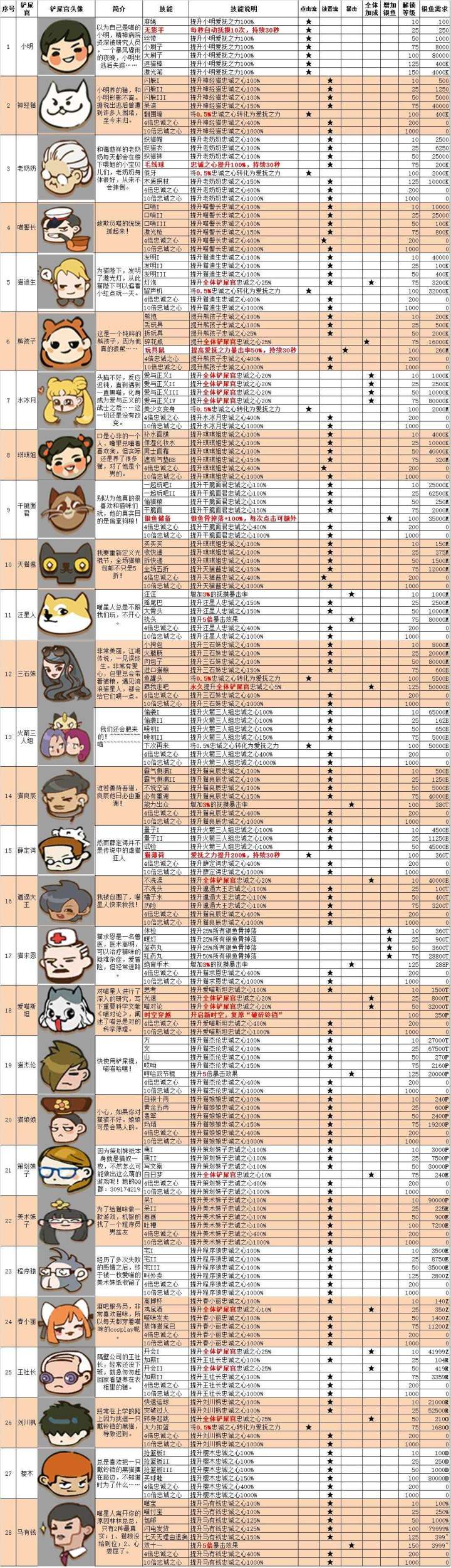 前言亲爱的各位玩家朋友,这里是您的智能猫宅管家咪咪儿~!今天为大家介绍的是最最重要的伙伴们。在各位猫宅手下尽心竭力的铲屎官们。(*ΦωΦ*)铲屎官一览(图文内容感谢玩家“花狸猫”的热心整理) 每一位铲屎官都有自己独特的潜能,千万不要因为铲屎官的等级比较靠前就轻视他们喵!快使用银鱼骨提升手下铲屎官的等级,便可以解锁相应的专属天赋技能啦。相信他们一定会成为大家攻略boss的一大助力!(=`ω
