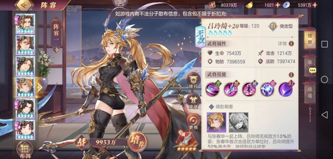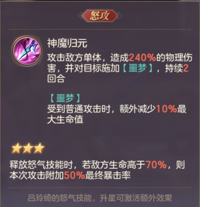 噩梦姜 核心武将:专武吕玲绮,姜维 原理分析:得益于吕玲绮专武以及噩梦效果,让单 纯依赖普攻的姜维输出最大化。 每次敌方受到普攻损失15%最大生命值 噩梦会扩散至地方全体并且噩梦不会被驱散。 该阵容依靠百分比伤害,生存是第一要义,所以将魂录优先点抗。缺点也挺明显的,需要较高的异常状态命中,不然小吕噩梦效果叠不上敌方完全徒劳。 小吕一号位战魂洗出基础怒气值的无双属性。 阵容图示 王元姬可变动,诸如刘
