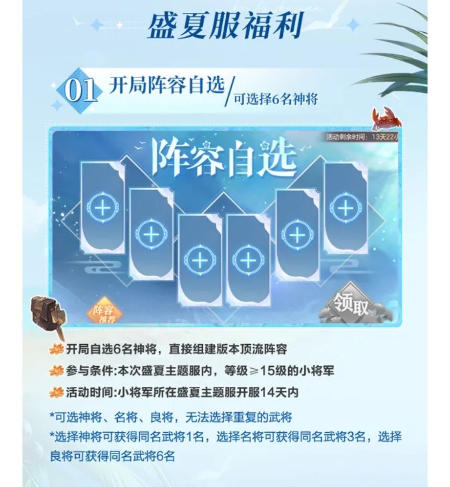 盛夏服开放时间是7月20日,没玩到幻想服的可以去盛夏服但是去盛夏服有几点需要注意。 盛夏服没有抽魂将的活动那个是诸葛服才有的,所以刚开区送的魂将自选先选魂诸葛,然后盛夏服应该会有讨魔招贤的活动,天天元宝买满的话可以有个三四层,会给一个魂将,这个魂将就选魂关羽。 前期过渡的话,你要是没有高星神将,就可以用张星彩,关银屏,蔡文姬,潘凤,邢道荣,甄姬这一个阵容,一星神将的强度是比不过3星以上的良将的,这