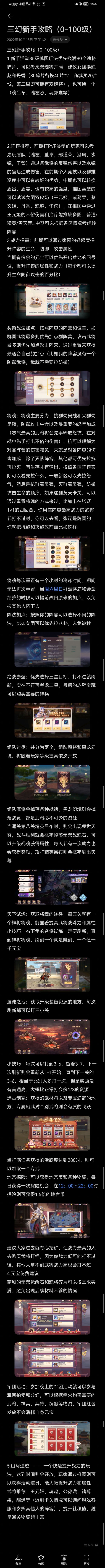 三幻新手攻略(0-100级) 1.新手活动35级桃园玩法优先换满80个魂将碎片,可以考虑双魂将开局,建议女团换魂赵和丹香(80碎片各换40片*2,商城买20片*2,第二周即可拥有双魂将),也可换一个(魂吕布,魂左慈,魂郭嘉等) 2.阵容推荐,前期打PVP类型的玩家可以考虑玩盾队(魂左,董卓,邢道荣,潘凤,水镜,于禁)通过各武将的反弹伤害以及水镜的复活造成伤害,在前期个人竞技以及群雄逐鹿中可以有较好的优势,中期也可以转换盾吕,盾姜,也有较高的强度,推图类型的可以试试女团双皮奶(王元姬,诸葛果,蔡文姬,丹香,魂赵,华佗),在推图中通过王元姬的不俗伤害和治疗能推较多图,普通/精英/黄天等...中期可以根据各区情况考虑转阵容 3.战力提高:前期可以通过家园的好感度提升阵容的生命,防御,攻击属性 当拥有多余的元宝可以优先开启营地的四号位,提升阵容的属性和战力(每个都可以提升生命防御攻击的百分比) 头衔战法加点:按照阵容的阵营和位置,如群国武将最多则优先加点群阵营,攻击武将最多则优先加点攻击阵营,通过重置来获得最适合自己的加点(比如我的阵容没有一个防御武将,我就不需要拉防御) 将魂:将魂主要分为,抗群蜀吴魏和灭群蜀吴魏,防御攻击生命以及最重要的怒气加成(怒气最高的武将将会先手释放怒攻,在对战中先手打出不俗的伤害),抗可以理解为对各阵营的伤害减免,灭就是对各阵容的伤害加成,除了灭队阵容,其他都可优先拉抗再拉灭,有生存才有输出,按照各区阵容实际可以看先拉什么,一般新区可以先拉怒气,然后是抗群蜀吴魏,灭群蜀吴魏,防御攻击生命的顺序,如果遇到黄天卡关,可以通过重置将魂的方式来过,比如卡在张辽1v1的四回合,你用你阵容最高战力的武将都打不过时,你可以去看,张辽是魏国的,你就把抗魏和灭魏放前面比如这样: 将魂每次重置有三个小时的冷却时间,期间无法再次重置,当周六周日群雄逐鹿和会武结算的时候可以提前改回原来的加点,以免被其他人挤下去 阵法加点:按照你的阵容可以选择不同的阵法,比如女团可以优先拉八卦,以免被秒 绝战赤壁:优先选择三星目标,打不过就刷新,实在不行再考虑二星,最后的赤壁宝藏可以购买需要的神兵 组队讨伐:共分为两个,组队魔将和黑龙幻境,将随着玩家等级提高依次开放 组队魔将会掉落各种战魂,黑龙幻境则会掉落战灵,都是武将必不可少的资源 当通关第八关精英吕布时,则会出现凐世天尊,战斗胜利就会概率掉落无双战魂石,可以升级战魂获得属性,每天都有一次助力也会获得奖励,攻打精英吕布则会概率刷出天尊 天下试炼:获取将魂的途径,每五关就有一个神将将魂,能显著提高武将战斗力和属性 小技巧:右下角的名将试炼一定要刷新,直到神将将魂,刷到一个就是赚到,一个值一千元宝 混沌之地:获取升级装备资源的地方,每次刷新都可以打三小关 小技巧:每次可以打到3-6,留着3-7,下一次刷新则会重新从1-1开始,直到下一关的3-6,相当于比别人多打一次,但是奖励没有首通高,大概比正常打会多1/3的资源 远古剑冢:获得幻武材料以及专属幻武的地方,专属幻武对个别武将则会有质的飞跃 当打满任务获得的活跃度达到280时,则可以领取一个专武 地宫探险:可以获得地宫币和各种物资,每日获得一次探险机会,在12:00~22:00时探险则可获得1.5倍的地宫币 建议大家进去就专心挖矿,让战力最高的人去购买武将打怪,因为你战力低可能打不过怪,其他人拿不到武将战力高也会打不过 4.元宝花费建议: 商城的无双觉醒石和魂将碎片可以按需求买满,避免出现后续材料不够的情况 军团活动:参加晚上的军团活动就可以参与军团拍卖和分红,可以根据需求购买需要的武将,神兵,兵符,绸缎等物资,军团红包发放不会消耗自身元宝 5.山河遗迹———一个快速提升战力的玩法,达到时间则会开放,玩家通过推图则可以获得活动道具,能大幅提升战力和属性 武将推荐:王元姬,魂赵,公孙瓒,诸葛果,貂蝉,水镜等(遇到卡关情况可以询问游戏客服和参照其他人的阵容),提升社稷值,越早通关物资越丰富