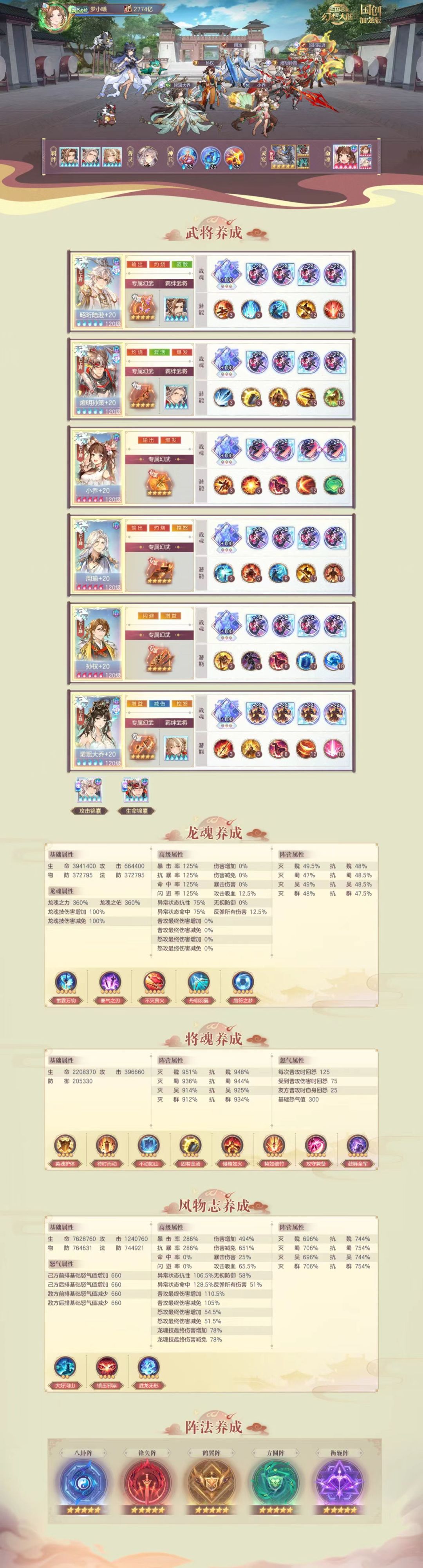 我心中的top1阵容肯定是我们火烧,首先就是要有三火以上魂陆逊(最好五火啦)搭鲁肃羁绊(好恨鲁肃羁绊掉战力) 作为火烧三大将之一(别问为什么不是四大将 吃鱼[表情_斜眼笑])有着优秀的灼烧机制 其次是我们的命魂孙权大人 自从命魂孙权出来之后 阵容分类就变成了有孙权和没孙权的区别 这套阵容里也是刚需五红哦 再其次就是二乔和魂孙策 魂大乔和命魂小乔 魂大乔搭配小虎(孙鲁育)羁绊 可以给吴国武将回复龙