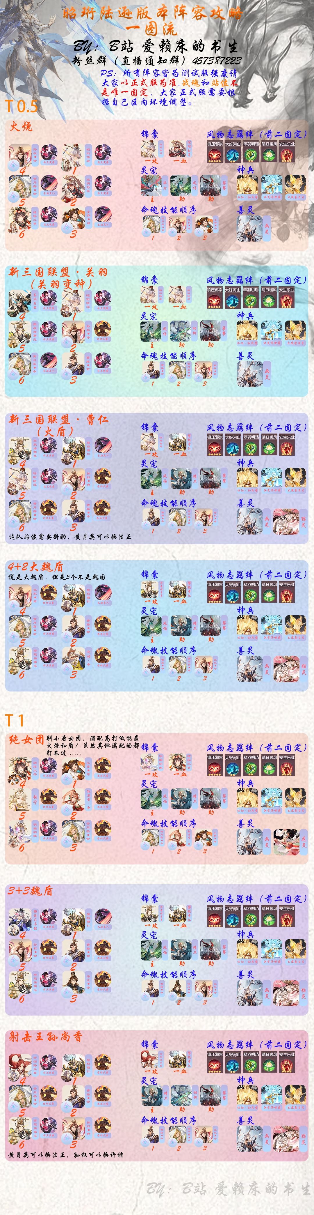 我心中的top1阵容肯定是我们火烧,首先就是要有三火以上魂陆逊(最好五火啦)搭鲁肃羁绊(好恨鲁肃羁绊掉战力) 作为火烧三大将之一(别问为什么不是四大将 吃鱼[表情_斜眼笑])有着优秀的灼烧机制 其次是我们的命魂孙权大人 自从命魂孙权出来之后 阵容分类就变成了有孙权和没孙权的区别 这套阵容里也是刚需五红哦 再其次就是二乔和魂孙策 魂大乔和命魂小乔 魂大乔搭配小虎(孙鲁育)羁绊 可以给吴国武将回复龙