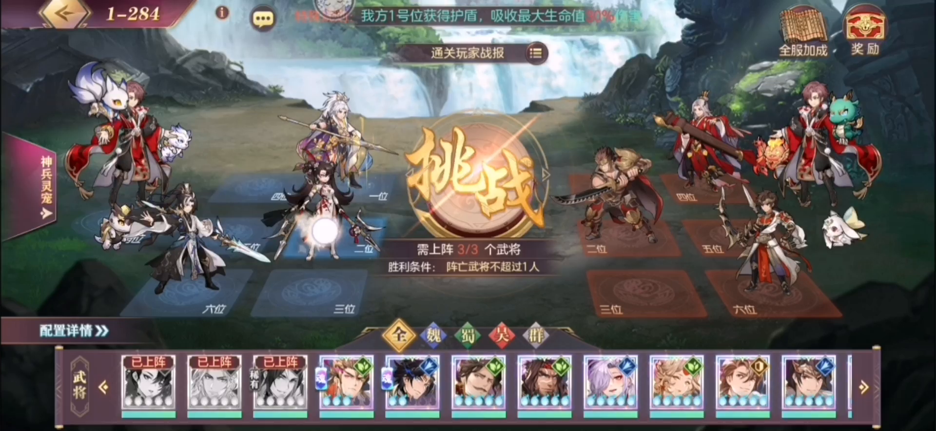 #奇谋战山河#【山河遗迹】社稷殿180万,无脑一键通关,二阶段131—140 阵容总结: 1v1 马超 2v2 马超 吕绮玲 3v3 马超 吕绮玲 姜维 4v4 马超 吕绮玲 姜维 公孙瓒 6v6 公孙瓒 好人曹 华佗 果子 马良(刘备) 姜维 以上阵容带三个专武,社稷殿蜀群优先点,阵容不过换位置多刷几次,无脑一键。