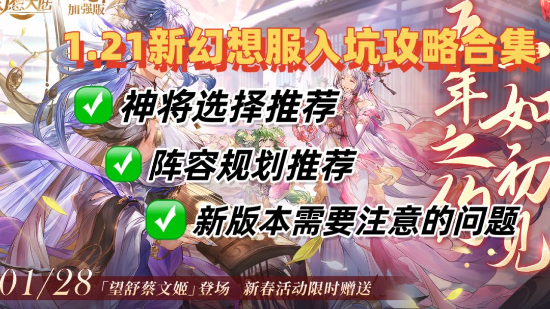 这次三幻的新春福利非常非常多!非常推荐新玩家入坑和老登回归!新武将【望舒蔡文姬】更是颜值强度都在线 本次会开放两个幻想服战区,分别在1月21日和1月28日开启,本攻略为大家带来幻想服武将自选和阵容搭配建议 注意:【望舒蔡文姬】是28日上线,21号的幻想服并没有,大家不要搞错时间哦~ 目录 一、单魂将自选建议 二、六神将自选建议 三、心愿单抽取建议 四、后期主流阵容搭配建议 一、单魂将自选建议 玩火