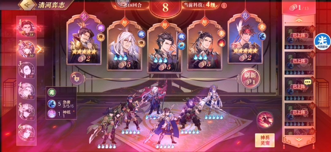 阵法:从左往右。配比:2 2 1 优先点第一个 好感度:优先上阵6将五级羁绊,其余均点,元宝最大化,互动尽量按拉取五火顺序依次互动。星图:优先特殊效果,其次点攻击生命防御 补:幻武拉取:蔡文姬水镜马良 宠物拉取:饕餮风伯 相柳(稀有自选碎片优先) 饕餮拉三星丢助战 相柳一星主战 风伯一星助战 命魂拉取:三火孙权 善灵拉取;画灵 神将五火顺序:与幻武相同 上阵神将只拉五星 刷分武将:魂司马(五火)