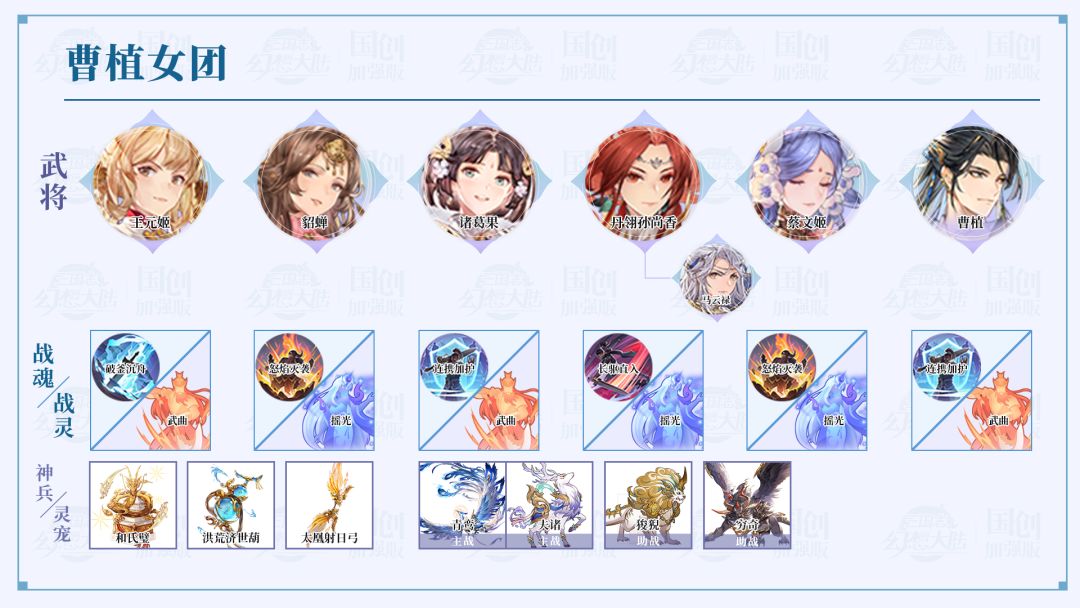 阵容分析 由于昭珩陆逊搭配陆抗,并激活陆抗3吴卡羁绊的组合方式,在新区的统治力依旧十分强劲,因此即使是女团玩家,也建议新区先用吴女火毒阵容过渡,到望舒蔡文姬等女团卡练度较高时候再转中后期纯女阵容。 幻想服专属福利选择分析 1、首日签到魂将选择昭珩陆逊:从pvp的层面来说,昭珩陆逊+陆抗+任一吴卡的3吴开局方式,相对来说是目前新区pvp的最佳选择。 2、开局自选6武将: 新区稳定不跑服的玩家,自选武