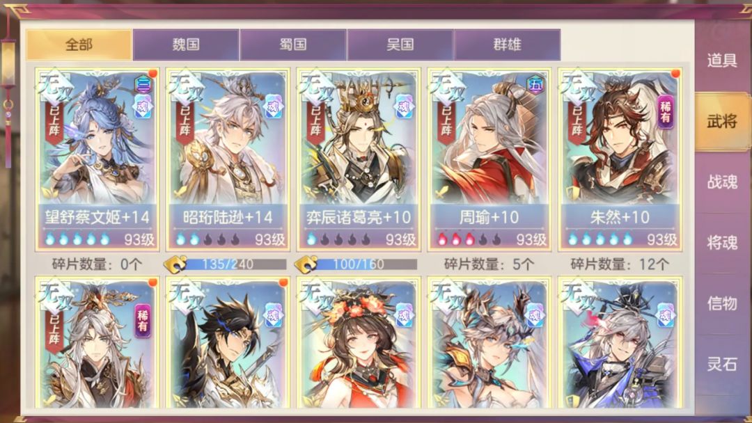 前言:前期最重要的就是全民无双任务,粉丝群688687107。 推荐队伍:女团 魂将招募:PvE选择蔡文姬,PVP则是吕玲绮 开局魂将自选:蔡文姬/吕玲绮(选择和魂将招募不同的那一个) 星光少女团商店:魂关羽碎片x60,魂大乔碎片x20 六神将:张宁,灵雎,诸葛果,伏寿,辛宪英,马良 心愿单:张宁,灵雎,诸葛果(这三个都五火后换伏寿,马良,优先灵雎张宁)武将礼包选灵雎。 关银屏小活动送的魂将碎片拿