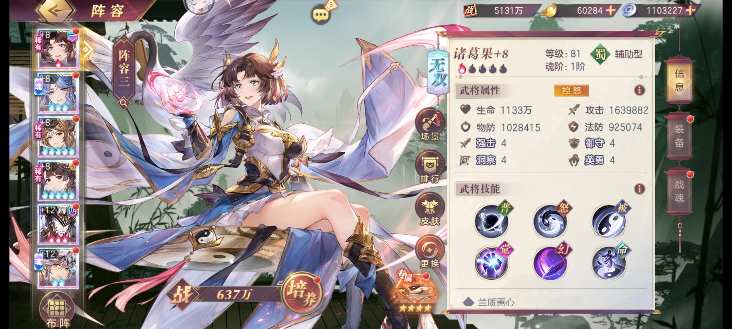 时间: 第832天 坐标:刘备幻想服A1585 1000-1100亿用时:36天 本来PVP阵容可以更早达成1100亿,但是为了不挨打,不得不上绯村剑心,只有一火而且无法进阶命魂,起码低了30亿左右。 目前最大缺口还是命魂武将,特别是张郃(一命),魔将(还是心月狐版本的阵容)打得还没抢得多,别人一刀100亿亿,我是打满4刀一百亿亿,魔窟,刷分都落后一大截,