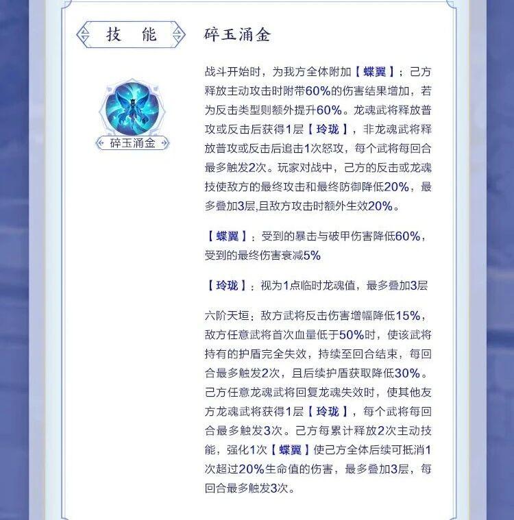 距离上次善灵更新已经过去接近半年,汐澜蝶灵拥有着靓丽的外表和强大的功能,具体效果让我们一同分析。作者:@玩家-幼崽注:玩家攻略非官方建议,仅供参考哦!PART01出战技能分析1.1技能和天垣效果1.2高数值增伤提供非常可观的无条件增伤,所有主动攻击都能获得60%伤害结果增加,在善灵里属于顶尖水平,而范围更小的反击伤害更是能提升120%,是可以产生质变的高额数值。1.3高数值减伤战斗