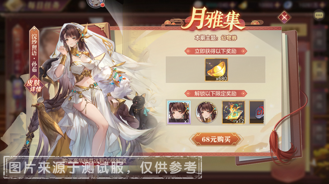 亲爱的小将军们:溪畔灵狸戏水流,浣纱影动素云柔。——一月“月雅集”上线。小将军可以通过每个月度完成“每日任务”获取月雅集进度,解锁“月雅集”标准奖励。另外,额外付费68元解锁“月雅集豪华版”后,达成指定等级可获得每月限定史诗级皮肤(本月为浣纱狸语·孙茹)、主题奖励(本月为幻穹券)等资源,助力小将军闪耀三国! 同时,本期月雅集皮肤返场分别为山水相逢·蔡文姬、卯兔攻鼓·董卓、战神至尊·邢道荣、飞熊