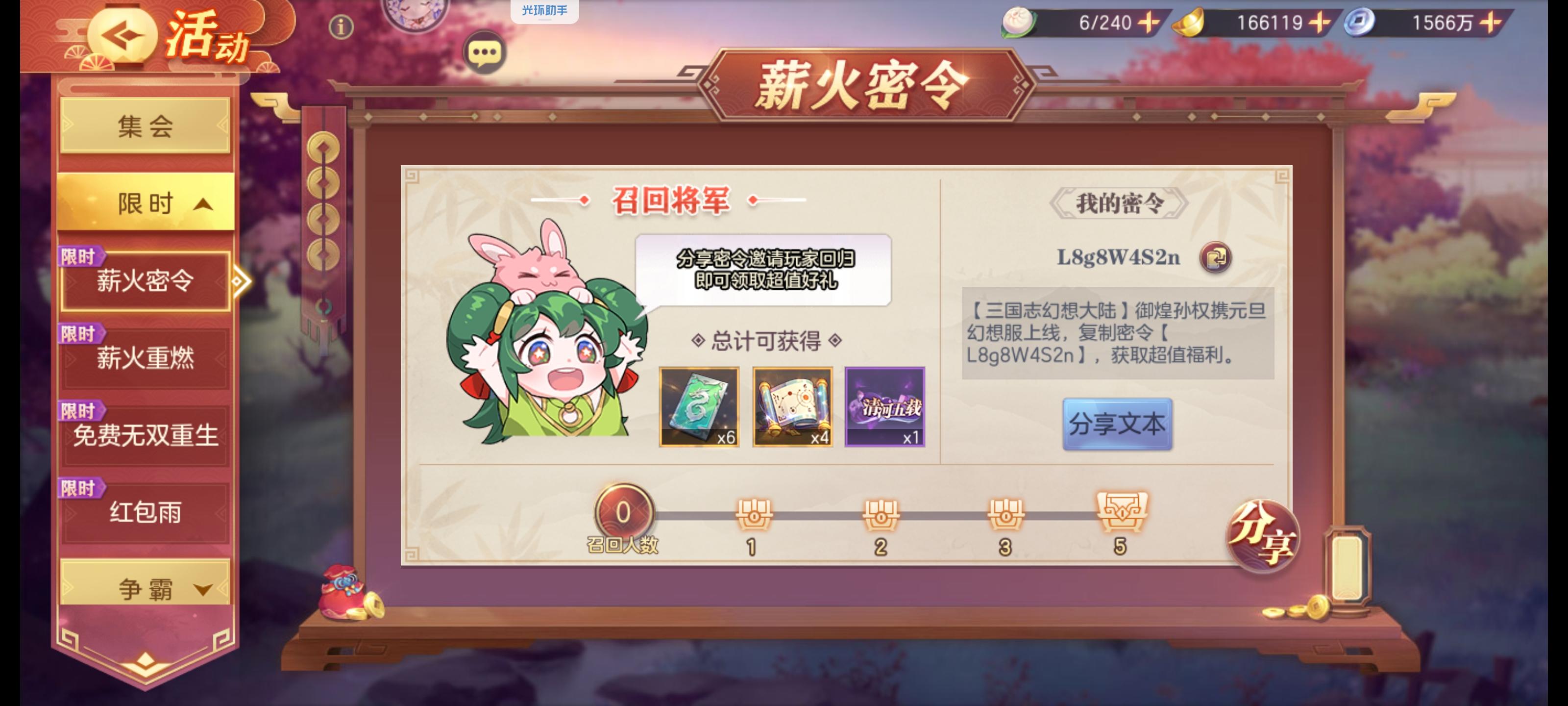 密令X6R9Q5A6N 结义370220001000485孙权服专属兑换码: 幻想20260101 元旦幻想服 炽剑垂天 权御万象 烽燧长歌 天火授命 龙章煌彩 御煌孙权 限时礼包码: 闲庭絮暖 2000天陪伴达成 万象更新 元旦幻想献好礼 长久有效兑换码: UYFD-HCRR-UPGJ vip520 破茧新生 再战清河 命魂现世 龙吟九州 代汉称帝