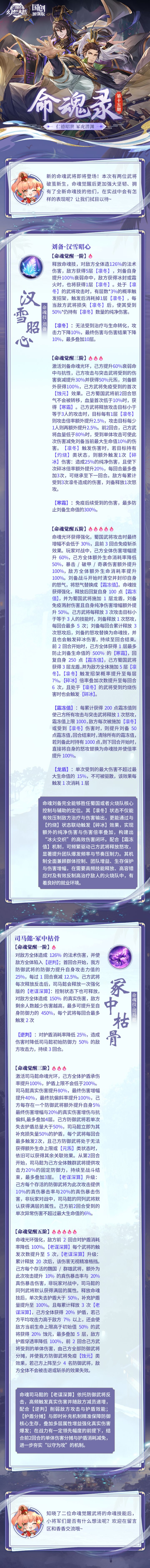 ⚔️ 《三国志幻想大陆》两位老将迎来命魂觉醒,新技能效果爆料引发玩家讨论 由广州灵犀互动娱乐有限公司自研自发的卡牌手游《三国志幻想大陆》近日有消息爆料,据悉刘备与司马懿两名角色即将迎来命魂觉醒,目前两位角色的技能已经提前爆料刘备的命魂核心在于“凛冬”状态,能压制敌方治疗并降低攻击力和伤害输出。司马懿则侧重于防御反击,依托队友反击触发真实伤害,并削弱敌方攻击力与护盾效果。两名角色达到三阶和