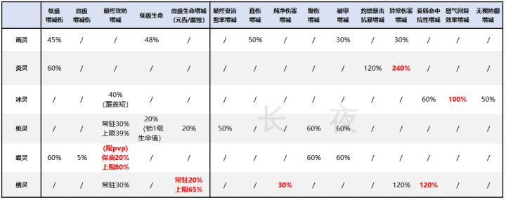 我宣布!善灵3.0时代正式到来!老规矩,先对比数值(仅展示善灵2.0画灵之后的所有善灵)。板块①(基础增减伤及三维数值):绣灵>蝶灵≈枪灵>画灵>炎灵>冰灵绣灵常驻30%最终攻防,相对来说是目前比较适中的数值,但优点也正是常驻,pvp和pve都有不错的表现。绣灵高额元炁一骑绝尘,适配版本。板块②(特化属性):绣灵>炎灵≈冰灵>枪灵>画灵>蝶灵炎灵依旧异常类特化善灵,数值非常定向。冰灵