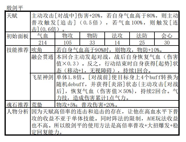 由于一些事情耽误了一天更新,抱歉。 殷剑平的阵法是火队,在公测版本中,迎来了重做。旧的火队阵法效果给了寒千秀,而殷剑平的火阵效果改为[对战中]伤害+10%,也注定了这个阵法以单体输出为主。不同于之前介绍的冰队阵容,火属性奶比较拉胯,带T情况下不足以支撑单奶的阵容。所以带T时只能牺牲打击面,阵容推荐为:殷剑平,鹿昭依,夏侯仪,白菀(上位替代封玲笙),幻镜陇妖(上位替代封寒月)/燕明蓉。除3火+奶固定
