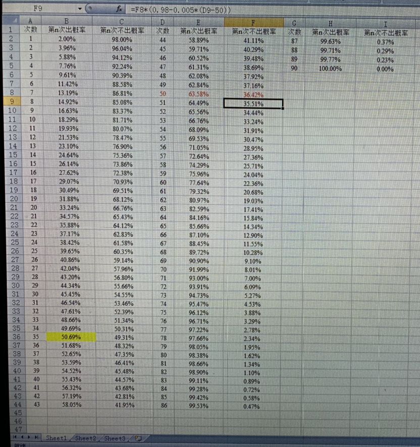 刚刚看到有人算抽卡概率,按照紫龙说的50抽以后每次累加0.5%,90次保底必出的规则来算的话,应该如下: 如果概率真的按规则来算的话,第35抽出的概率刚好过50%,但是抽的多的大佬说紫龙会把概率人为控制在2%,是不是按抽出的绝卡数➗总抽数来看,如果低于2%就让你更容易出,高于2%就拖一下? .……………………………………………………………… 解释一下,表里黑框的连续51次不出绝概率的计算方法,在最