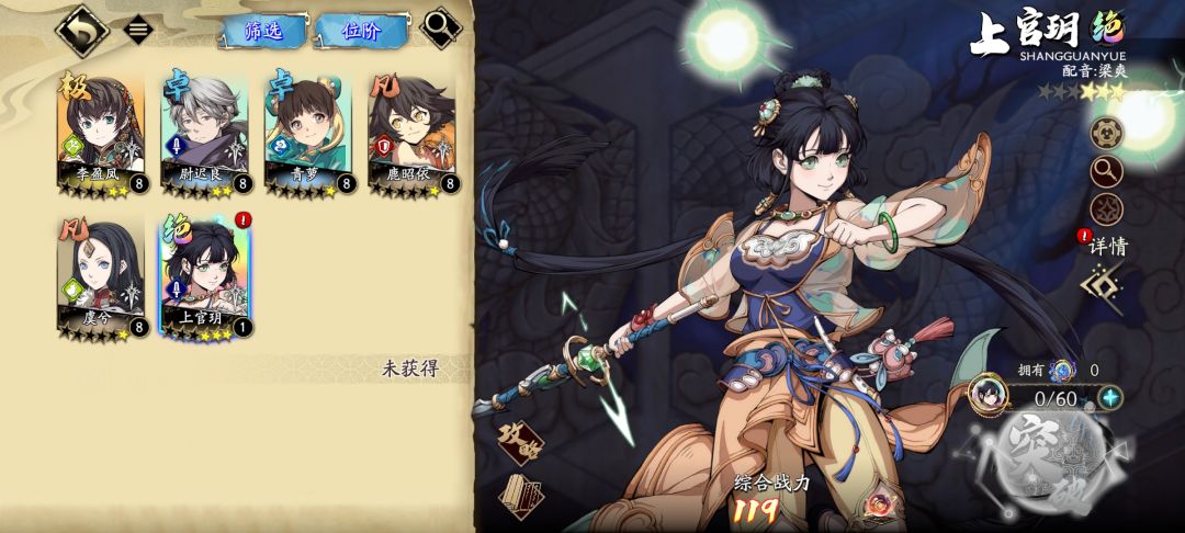 狼:4星双线满 5743战 刚需一个防短腿戒指 优衣:4星双线满 大跳3c 6259战 全输出向 树:5星双线满 协攻3c 6925战 毒魂石 安逸:5星1.5线 6内aoe3c 6211战 有伥厉可无限3c更好我没有好属性,带的罗鬼 典藏兮:4星1.5线6内 治疗魂石输出魂石均可,肉一点更好 御卿:4星1.5线6内 肉治疗魂石 印章不选敌方免疫debuff和施加debuff,无剑邪助战,减治疗选