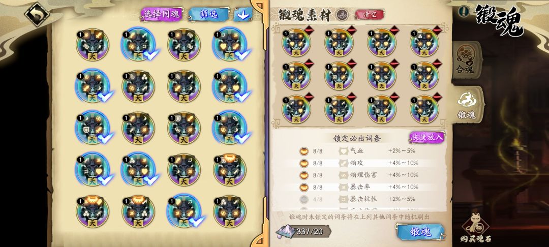哈哈哈,新的合魂系统出来了,看看。锁一条词条需要8条目标词条,最多可以放12个魂石。①只锁1词条需要8个带目标词条魂石,太亏了。 ②锁2词条需要2种目标词条各8个和2个幻月散,也就是说至少需要4个2种目标词条的魂石和1种目标词条魂石各4个,太亏了。 ③锁3词条需要3种目标词条各8个和4个幻月散,至少需要2种目标词条魂石12个,而且每种目标词条一共刚好8条,怎么说呢,条件有点苛刻。 ④锁4词条需要4