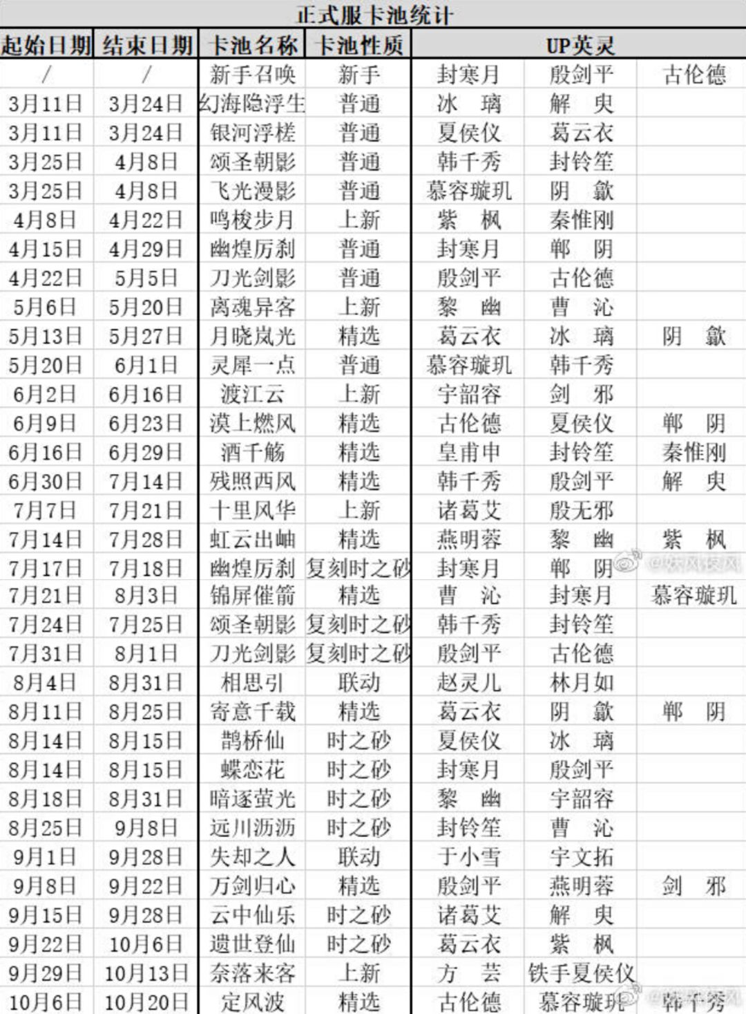 天地劫正式服卡池统计(10.6更新)(抱歉,已停更)