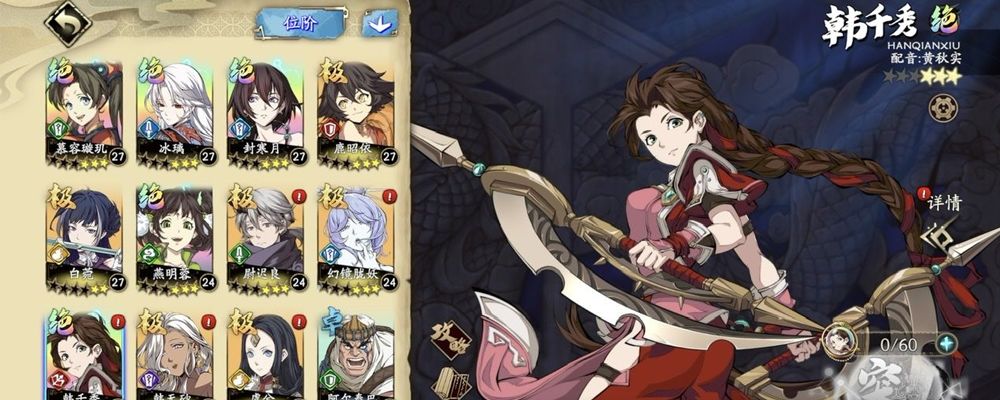 我不是很喜欢PVP那种特别紧张的氛围,所以一直没怎么打,最近出国刚回来隔离,咸着也是咸着,就开始了。 从青铜2开打,耗时三天,总算在最后一刻打完了。说说感受。 黄金1前挺简单的,可能是我练度占优,反正就一波连胜就黄金1了。然后白金确实不太好打,不过我一天也只打十几盘吧。 感觉有一个被严重低估的角色,阴歙,真的很强,配合高练度小宫主,很无借,因为主流阵容都是冰璃(一般还都是反击定魂和突刺) 曹沁 黎