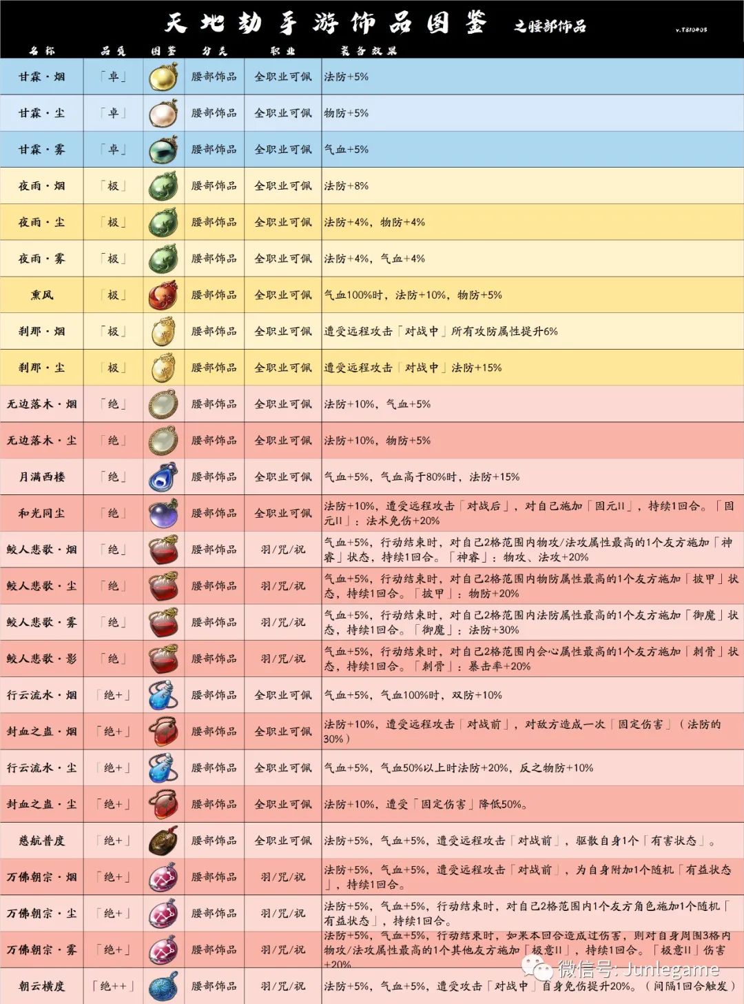 游戏进入中后期开始收集饰品了,但第一次见游戏管哪儿找不到图鉴,有收集癖玩起来特别累,跟群里玩家交流总结了一下自制了个饰品图鉴自己看的,数据以官方为准。 收集绝饰品很有意思,但玩过梦战的应该都知道不能急,可能要过一年后才能陆续有人完美收集。(带+号的绝品是极力推荐的,有绝++务必上锁并发帖炫耀下。短期别拆带+的绝,图片字体问题请放大食用或PC端查阅) 【腰部饰品】共26,3卓,6极,以及17绝: 【
