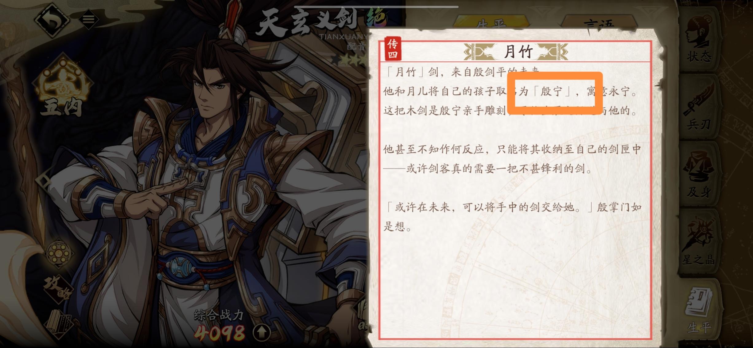 这里面提到的角色,不知有没有机会入手呢上官玥的哥哥墨竹,殷掌门的女儿殷宁天上四仙子的云杏,幽姬流舞的夫婿憾天文、物、德、刑四相,其中刑相霜肃已经有立绘了还有这个昊天,会不会也能来一个