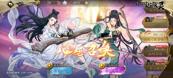 天地劫幽城再临将于4月29日10:00开启限定召唤江湖夜雨,绝品英灵天玄义剑、第二瑛召唤概率提升。本次召唤新增时之砂机制,可将已满星UP英灵的额外碎片转换为另一名UP英灵的碎片。同期开启山河异动限时三魂任务、春日载阳登录领时之印、祈念之轮抽上官玥新时装锦鸳逗晴以及七日赠礼累计签到等活动。信息来源:天地劫官方两位新英灵同时UP,时之砂机制让满星玩家碎片不浪费。登录送时之印和灵蕴石,算是常规福利。
