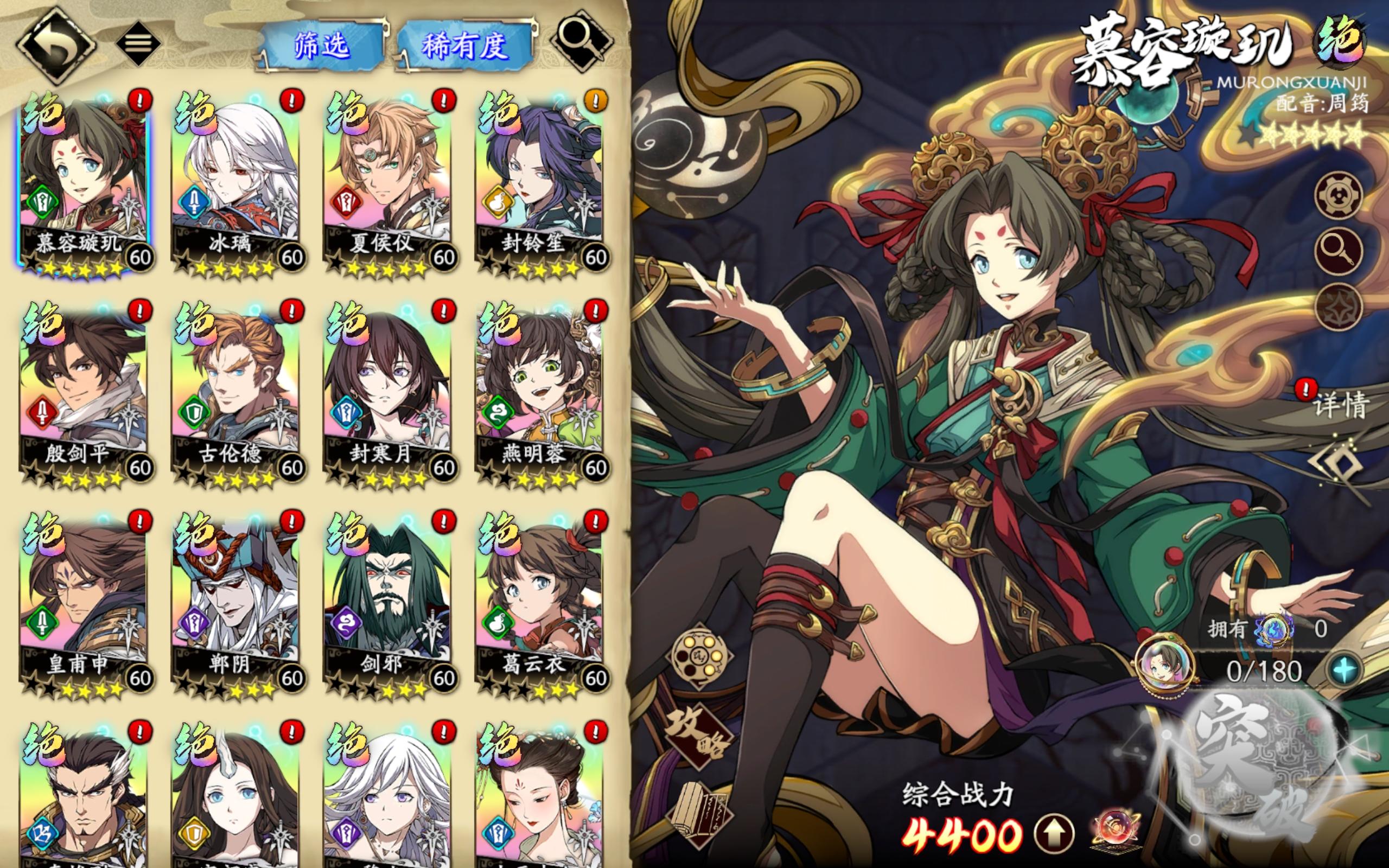 2个多月新号,栾,夏侯仪,依依拉满,其他及身都没材料拉 全部11级,3c拉了一半开了技能,很难玩