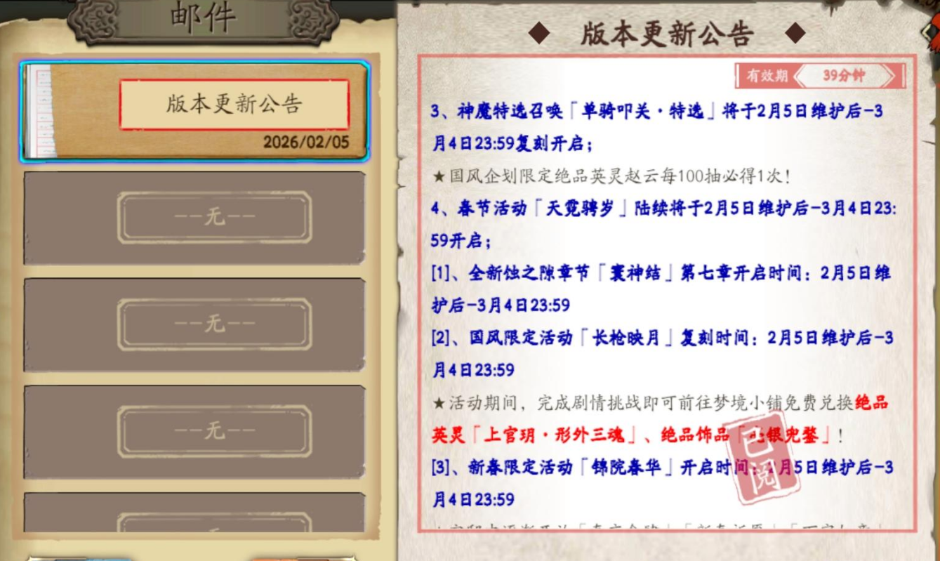 省流:1. 琴色、尉迟慎双UP,并且有320累抽奖励。2. 国风企划复刻:赵云、上官玥限时返场(上官玥送,赵云卡池抽取)。3. 时之隙寰神结第七章开启。4. 春节活动。5. 12宫·妄幻复刻返场。6. 百川辑异最终阶段开启。7. 波旬、幽冰璃开启3C。8.去年春节有山河异动的,这次没看到,没有的话可以开冲了,楼下补张去年春节山河异动的截图。