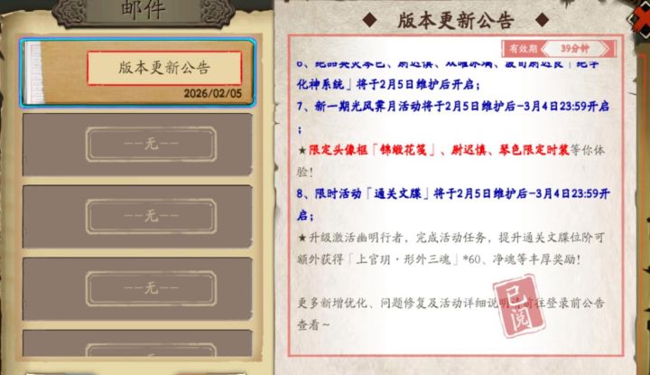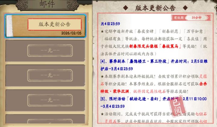 省流:1. 琴色、尉迟慎双UP,并且有320累抽奖励。2. 国风企划复刻:赵云、上官玥限时返场(上官玥送,赵云卡池抽取)。3. 时之隙寰神结第七章开启。4. 春节活动。5. 12宫·妄幻复刻返场。6. 百川辑异最终阶段开启。7. 波旬、幽冰璃开启3C。8.去年春节有山河异动的,这次没看到,没有的话可以开冲了,楼下补张去年春节山河异动的截图。