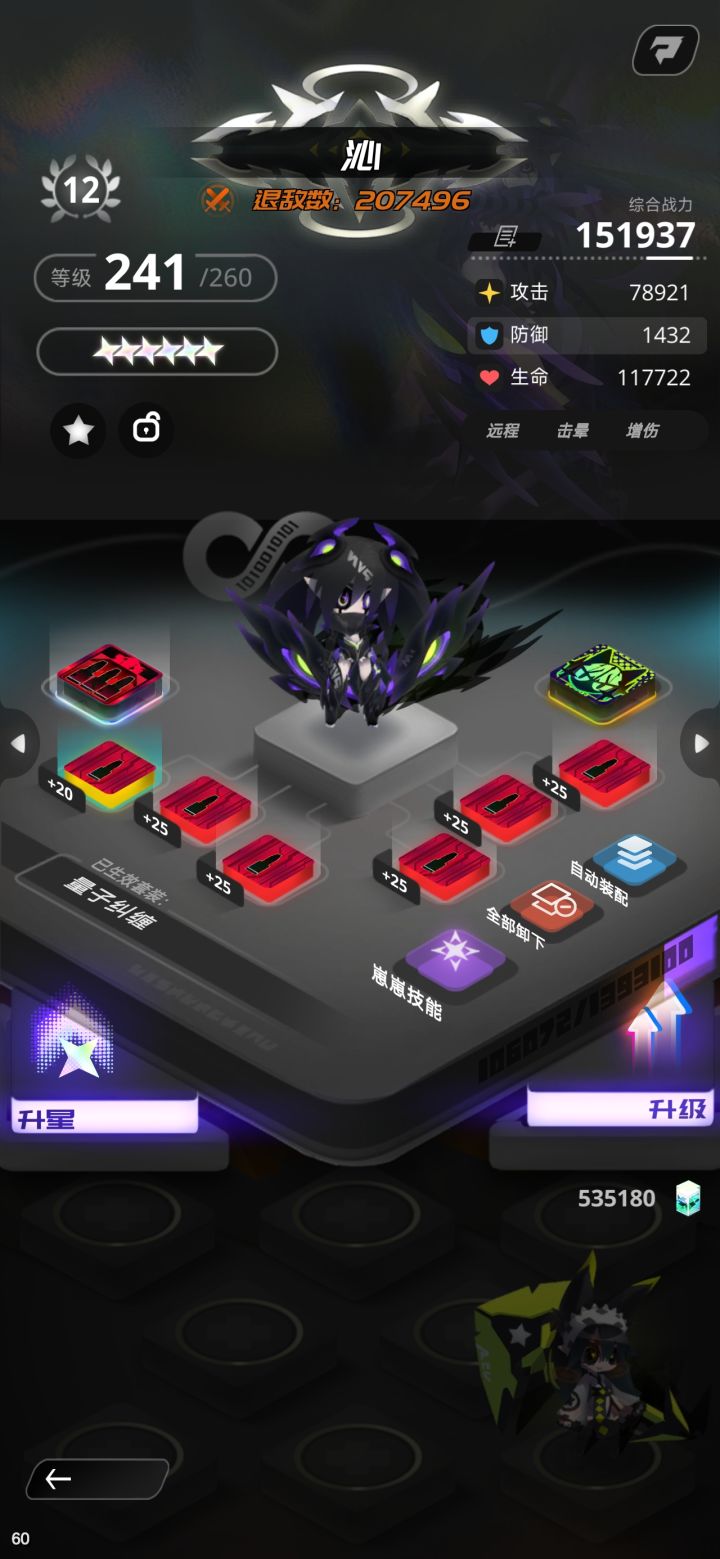 42、孵蛋优先选择没有白色也就是半星角色的蛋,即使是2小时的白白系列蛋也有概率出白色角色,消耗的时间和分解所得材料非常亏43、不推荐白色崽崽升到紫色分解,因为到最后限制芯片兑换材料的是进化液的数量,白升蓝获得材料与进化液比例为3:1,而蓝升紫为3.75:1,所以蓝升紫更赚44、红芯片主属性攻击的值在60-80,升满为1080-1440,所有红芯片主属性升满都是基础数值的18倍45、黄星到后面