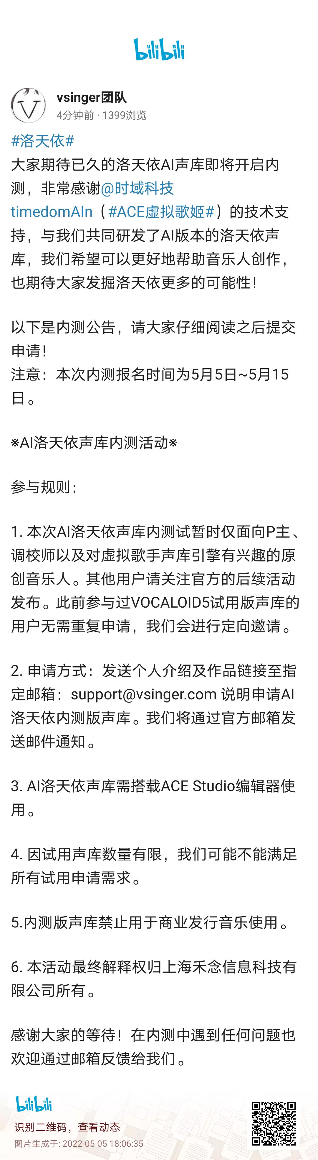 [快讯] 洛天依ai声库即将开启内测,引擎确定为ACE虚拟歌姬(需搭载ACE Studio编辑器使用)