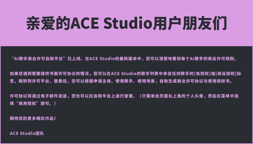 【ACE Studio】AI歌手商业许可自助平台上线(转载)