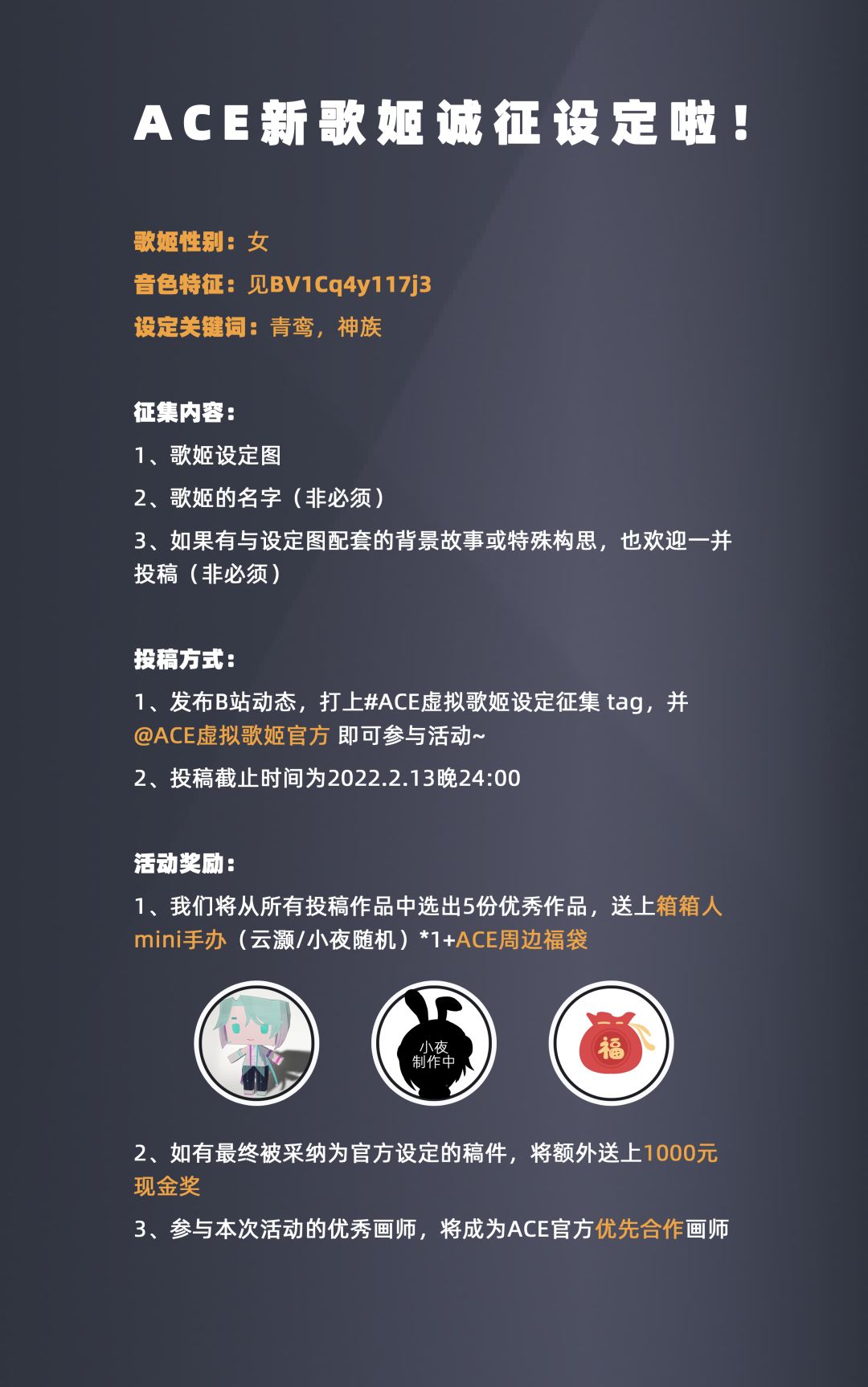 先放个图~预览视频链接在图片下方 歌声预览视频链接: ==============视频简介================ 歌姬性别:女 中之人:(来自) 设定关键词:青鸾,神族 征集内容: 1、歌姬设定图 2、歌姬的名字(非必须) 3、如果有与设定图配套的背景故事或特殊构思,也欢迎一并投稿(非必须) 投稿方式: 1、发布B站动态,并打上#ACE虚拟歌姬设定征集 tag,即可参与活动~(建议同时