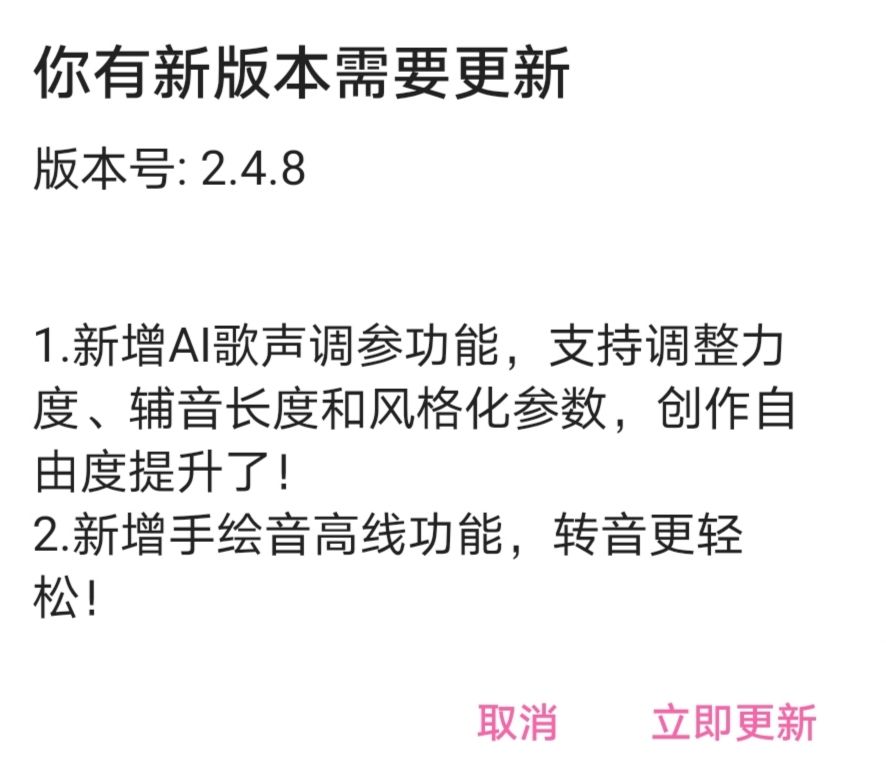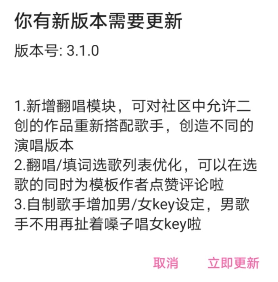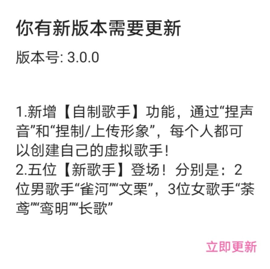 请注意!!!由于此版本涉及重要数据结构更新,服务器将不再支持老版本,所以此次为强制更新!!! 1.新增【自制歌手】功能,通过“捏声音”和“捏制/上传形象”,每个人都可以创建自己的虚拟歌手! 2.五位【新歌手】登场!()分别是:2位男歌手“雀河”“文栗”,3位女歌手“荼鸢”“鸾明”“长歌” 补充: ①新的ai歌手将不再提供对应的本地音源,取而代之的是统一的钢琴音源 ②自制歌手后,歌手名字不能二次修改