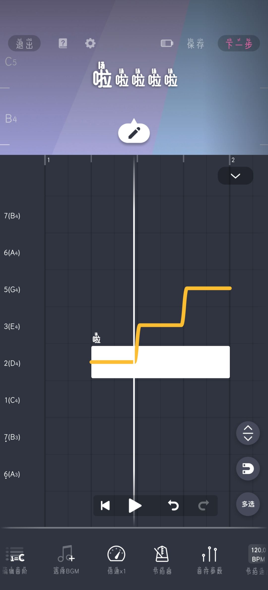嘿,许久不见! 如果你还没有看过进阶篇(上),请先看上篇: 本次教程将作为面向小白教程的最后一篇,在本篇中你将了解一下知识: - 认识波音 - 给歌曲增加颤音 - 给歌曲增加一些声调(实验性) - 再识BPM - 超广音调范围的适配方法 OK,话不多说,一起摇滚吧! 1.认识波音 数字6上面有个像浪线一样的东西,这个叫做波音。 就是要将6变676,其中,67占的时长较短 如下图所示。 以此类推。1