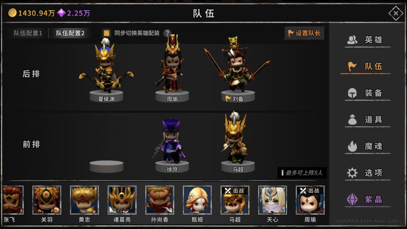 本攻略涉及附魔诸葛,速怒马超和肉装刘备装备详解。 众所周知,由于诸葛的上限问题,能够带队秒到110+层,再往上就是各种刮痧了。 然后再往上爬塔的最优国家队则是天心带队(4个工具人:刘备,马超,夏侯渊,孙尚香)。 本攻略就是在甜心国家队的基础上再提速。 首先,如何提速? 当然是增加一个输出点啦。 鉴于本方人员的特点,刷图小能手孔明先生当仁不让继续加入往上爬的队伍。 首先上阵容。 考虑到国家队中香香过